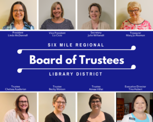 The Board of Trustees of the Six Mile Regional Library District is a seven member board elected “at large” by the constituents of the Library District. Elections are held every other year, in odd numbered years, with two seats on the ballot each time with the exception of the third year, when three seats appear. Each term is six years. Board members are not compensated for their service to the District. Trustees derive their authority and responsibilities from state law, 75 ILCS 16/ Public Library District Act of 1991