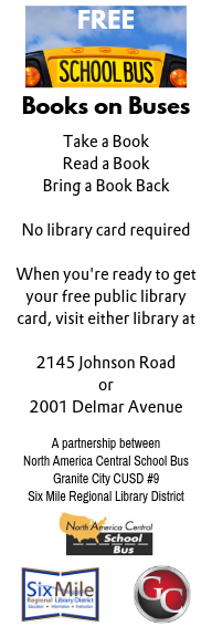 The Books on Buses program is similar to the Little Free Library concept where folks are invited to Take a Book, Share a Book. Six Mile Regional Library District is supplying the books for ages 5-15, and North America Central School Bus is providing safe containers to hold the books on the buses. Books are entirely free and do not have due dates – students can read the books on the buses, take books home, return the books to the buses to share with others and to choose new titles to read, or even keep favorite books. While every student in the Granite City School District is encouraged to get their free SMRLD library card, a library card is not needed for the Books on Buses program.