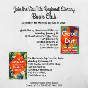 The Husbands by Chandler Baker: Monday, February 23, 11AM at Meme’s Coffee Shop, 1529 Johnson Rd or Tuesday, February 24, 6:30 PM at SMRLD, 2001 Delmar Ave