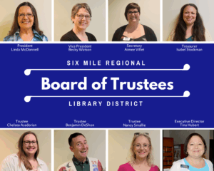 The Board of Trustees of the Six Mile Regional Library District is a seven member board elected “at large” by the constituents of the Library District. Elections are held every other year, in odd numbered years, with two seats on the ballot each time with the exception of the third year, when three seats appear. Each term is six years. Board members are not compensated for their service to the District. Trustees derive their authority and responsibilities from state law, 75 ILCS 16/ Public Library District Act of 1991