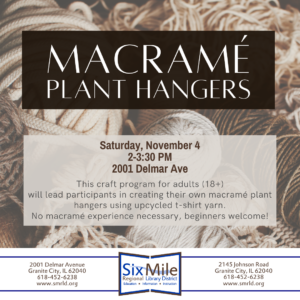 will lead participants in creating their own macramé plant hangers using upcycled t-shirt yarn.